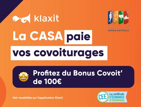 Depuis juin 2023, la Communauté d'Agglomération Sophia-Antipolis s'est associée à Klaxit, leader français du covoiturage domicile-travail, pour promouvoir cette solution sur notre territoire. La CASA aide au covoiturage en prenant en charge les trajets domicile-travail effectués via l'application Klaxit. Les passagers bénéficient de trajets offerts, et les conducteurs reçoivent une subvention allant jusqu'à 3€ par trajet et par passager.